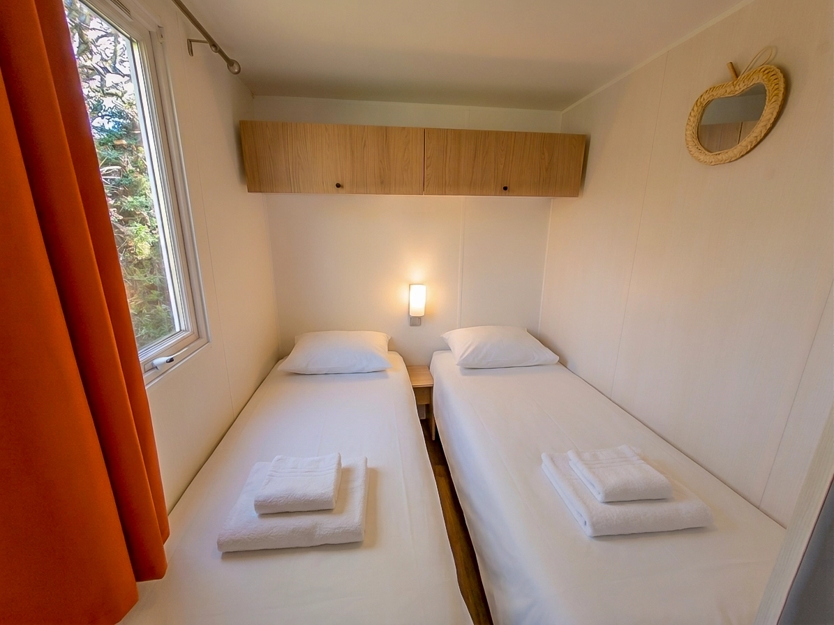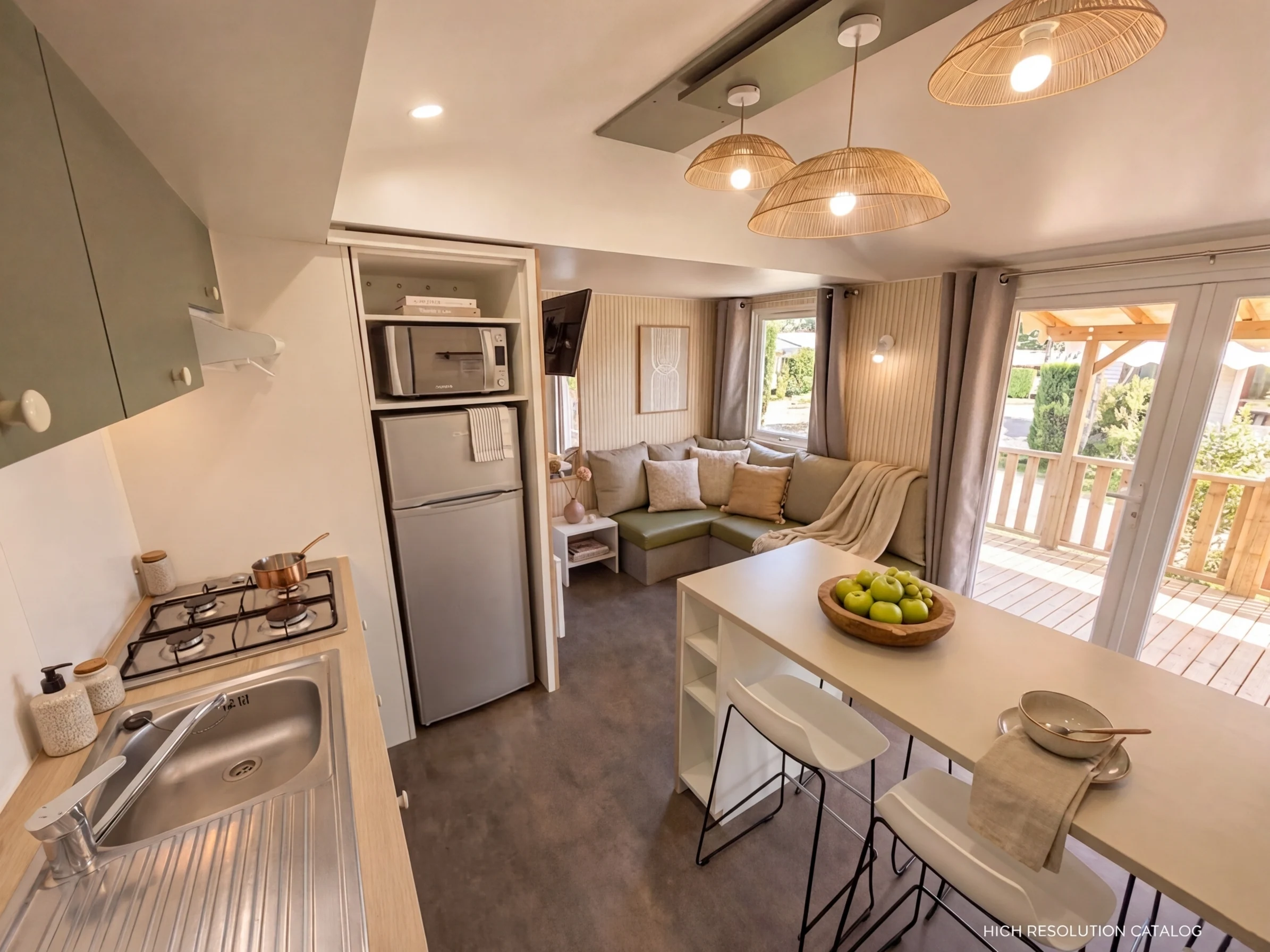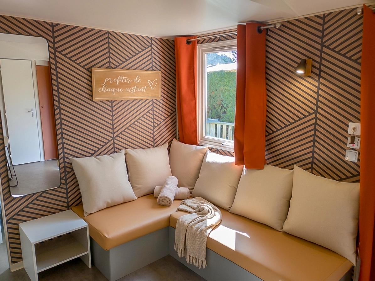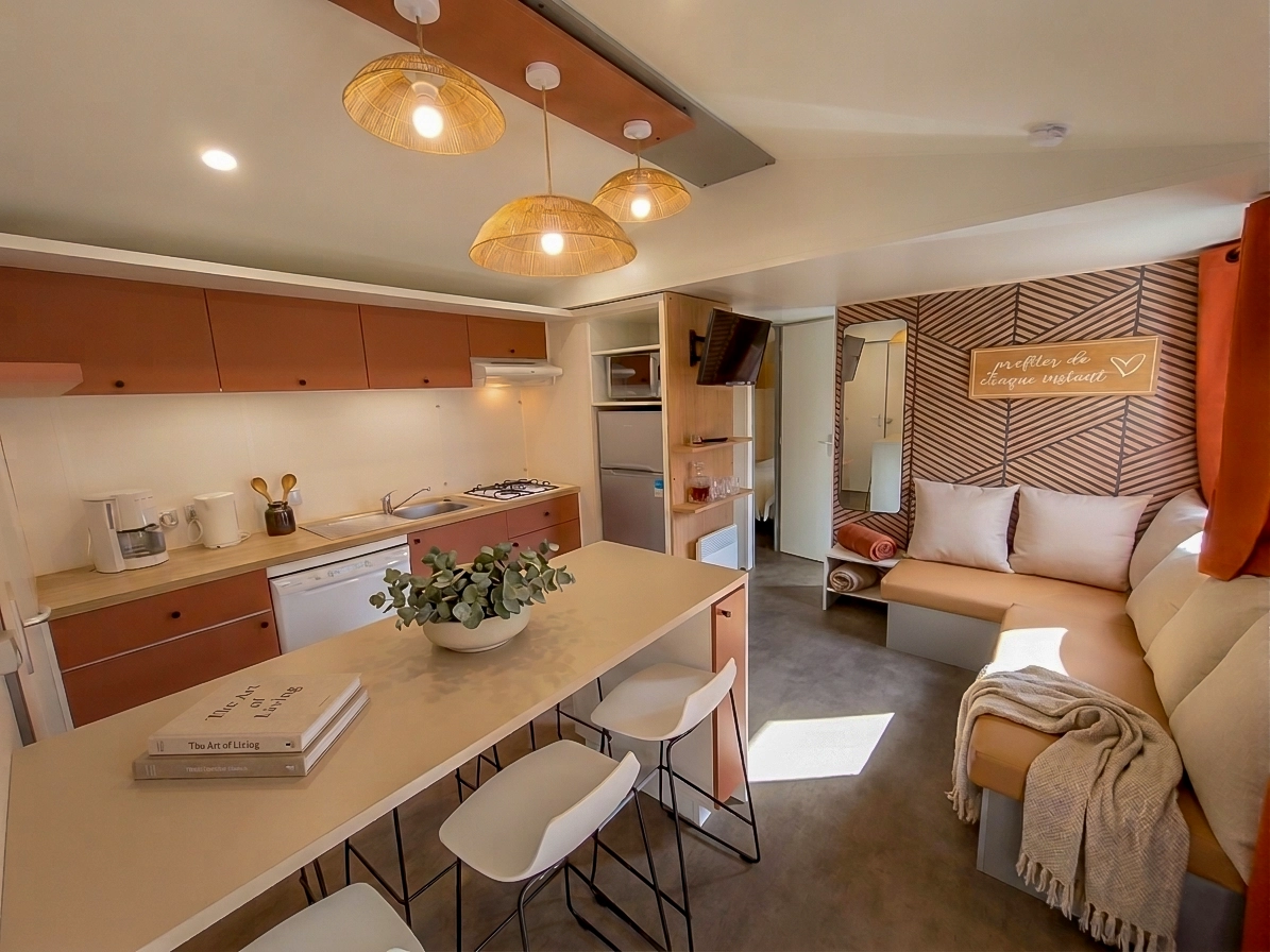 Its greatest asset is undoubtedly its size! An American kitchen opens onto a large living room for holidays with all your family or loved ones. In summer, the campsite has 2 offers, Evasion or Zen – it’s up to you to choose which package you prefer! A complete makeover for the “ZEN” cottages starting in 2026.